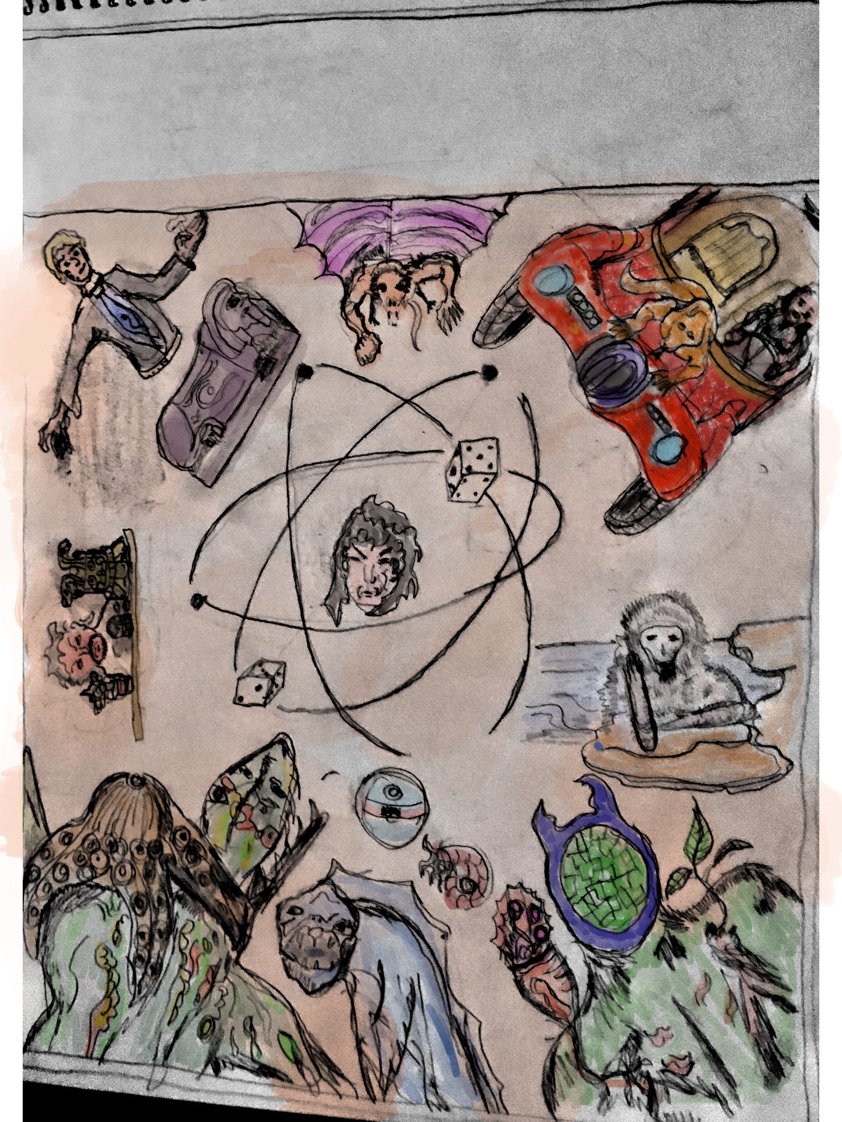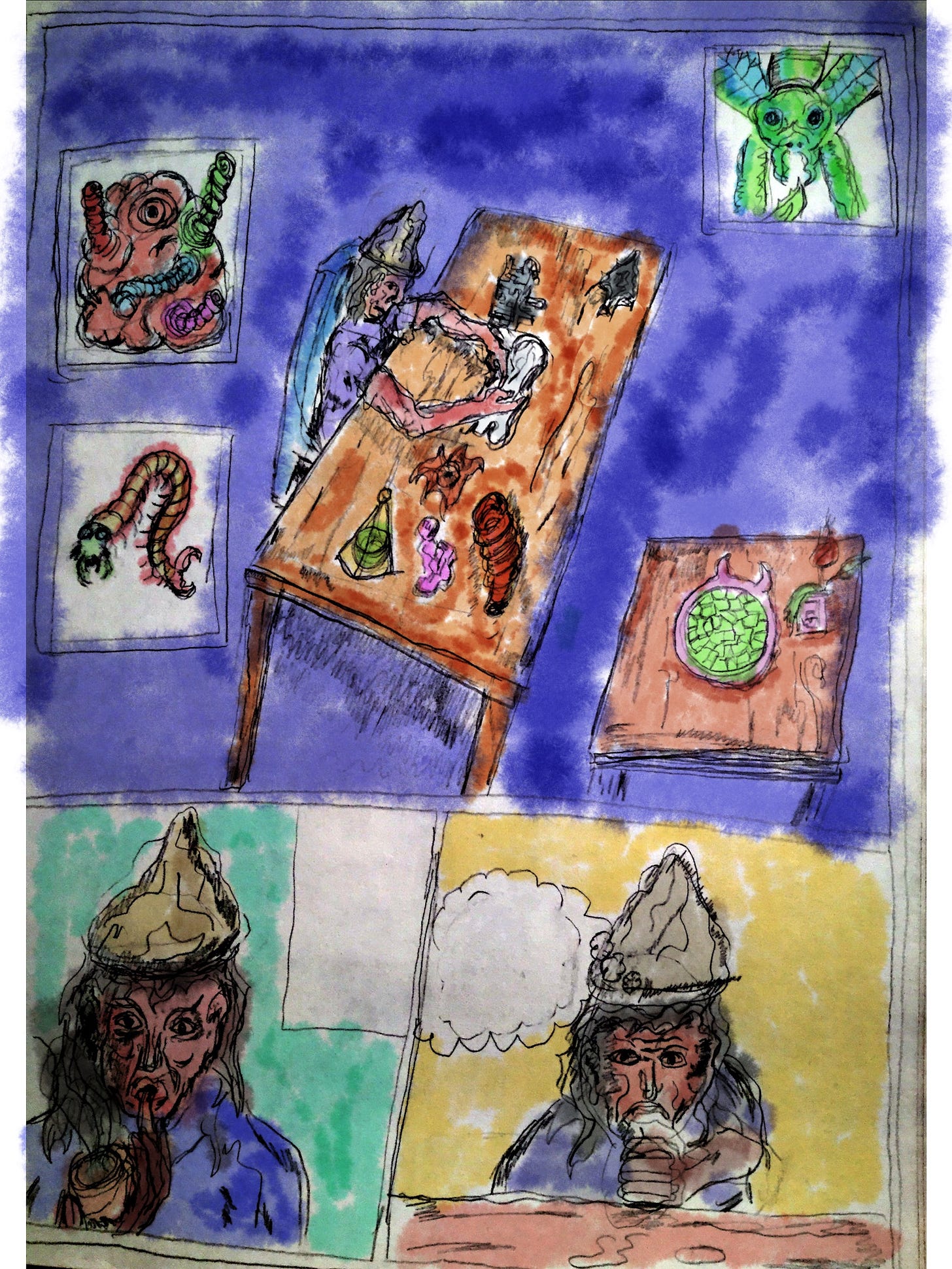 This was a comic concept I was working on some years back. The premise was a main character that some experience with the quantum world, and researched aliens in a military containment center/workshop. Because of his relationship with quantum energies he had some ability to communicate with the aliens he was researching, but had to solve puzzles and clues to do this. Archeology and art artifacts were involved and he would go to the elite auction houses of the world, like Sotheby’s in England, to obtain items, also from archeological sites, and bargaining with looters. I ment for thé items to be real ones, researched and drawn accurately, also with regard to prices, however the items would have some kind of quantum energy power with regard to the aliens under study. I had fun with this but never got very far on it. I have started many comic tittles, but only got a little bit going with another, somewhat similar tittle Quantum Psychotherapy, one work I hope to feature in this newsletter.